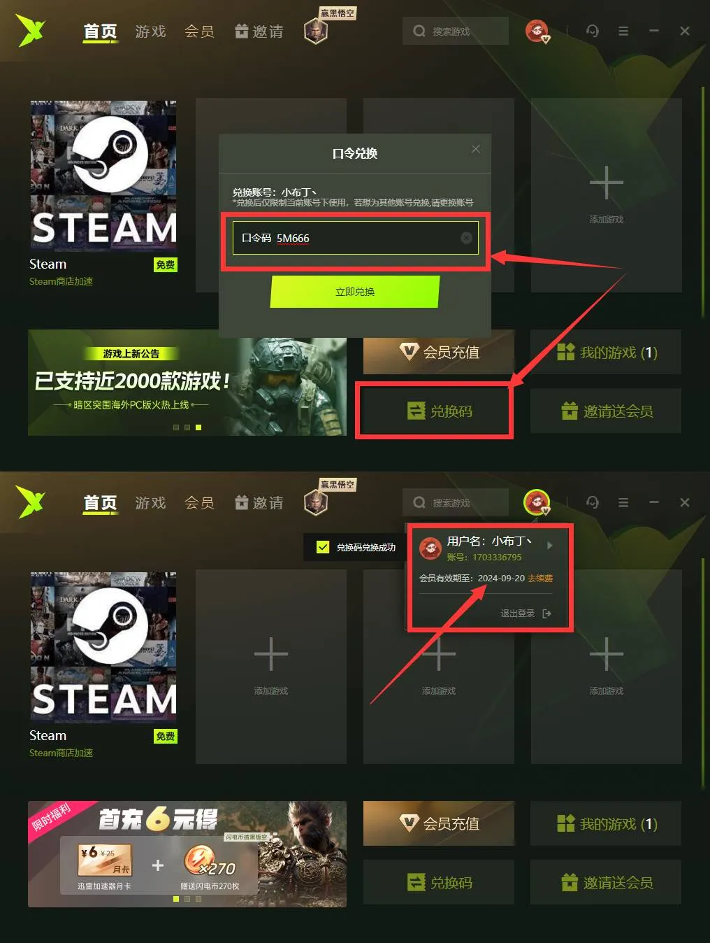 使用方法:下载电脑版迅雷游戏加速器并安装,注册登陆账号,点击首页的“兑换码”,输入“5M666”即可领取7天。新号注册赠送24小时,首月开通只需1元/月。很实惠哈!到期后可以换个账号继续领取。