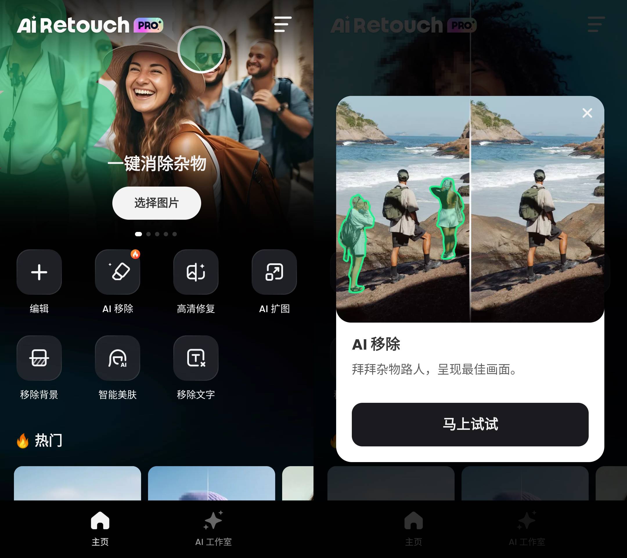 AI Retouch是一款基于人工智能技术的手机图片编辑工具,专注于通过AI算法一键移除照片中的不需要元素(如水印、文字、人物、瑕疵等),并提供背景替换、皮肤优化、高清修复等多功能支持,适用于日常修图、创意编辑及专业级图像处理需求。